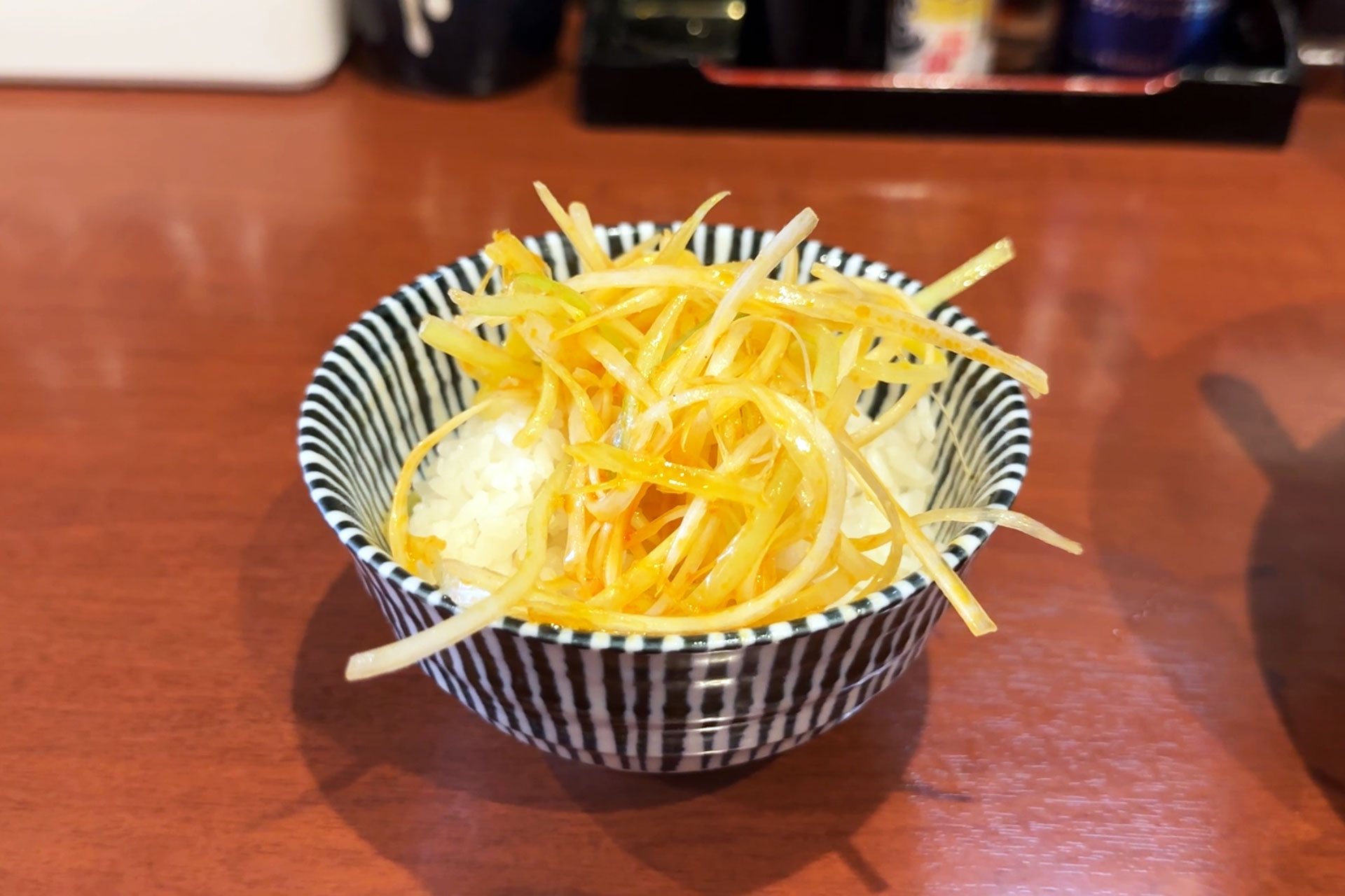 スープに沈めクタらせた葱。オンザライスからの辣油BUKKAKE!!