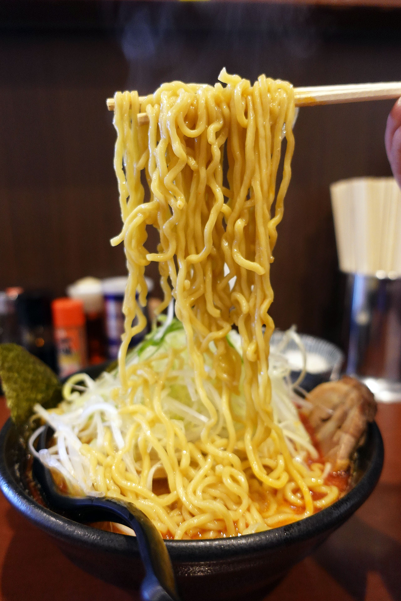 白ねぎ山盛りでねぎ好き歓喜「辛ネギみそらーめん大¥1300」。スープの紅とのコントラストが美しい。冷える日は辛いものを欲する。