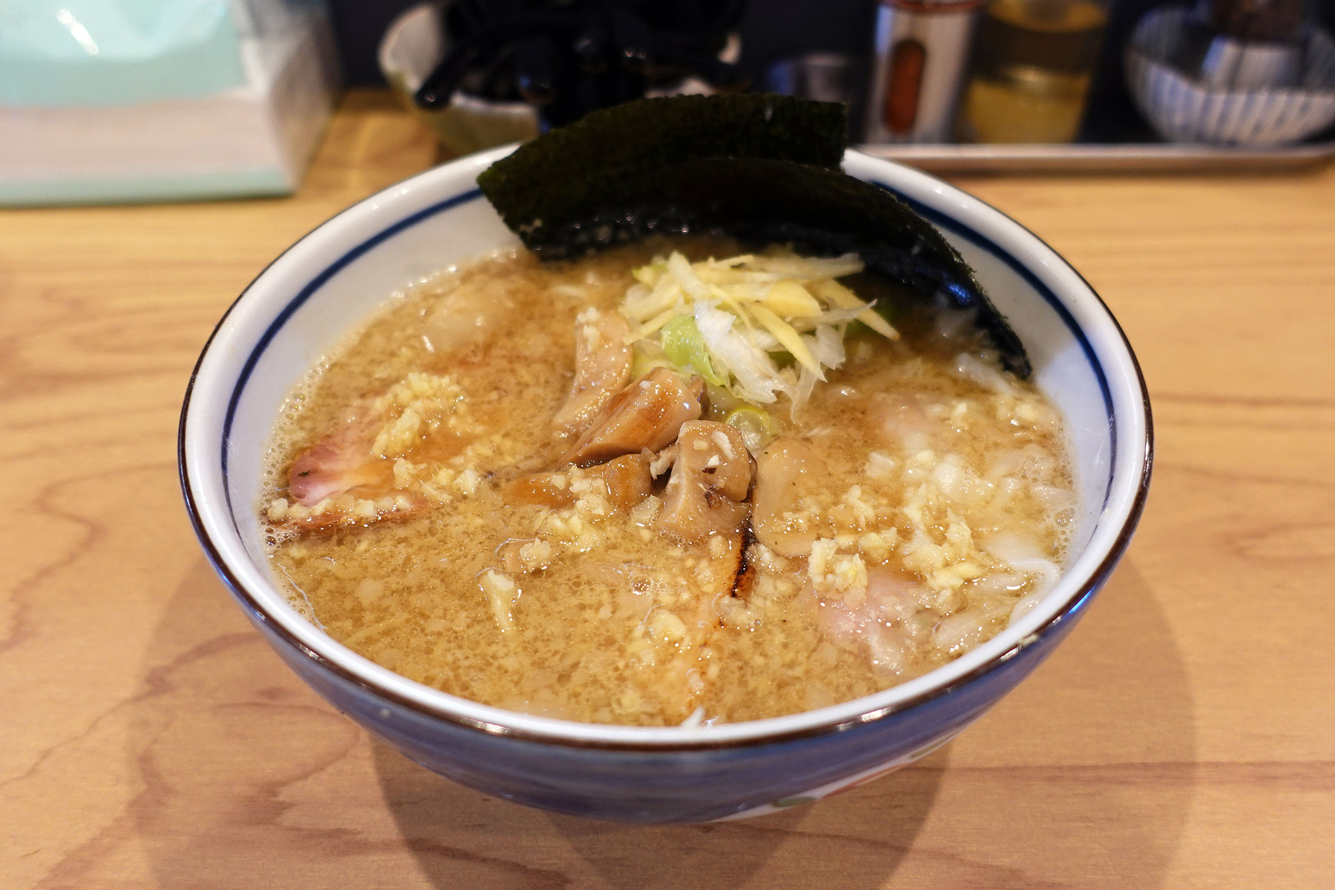 刻み生姜と背脂が美しい。