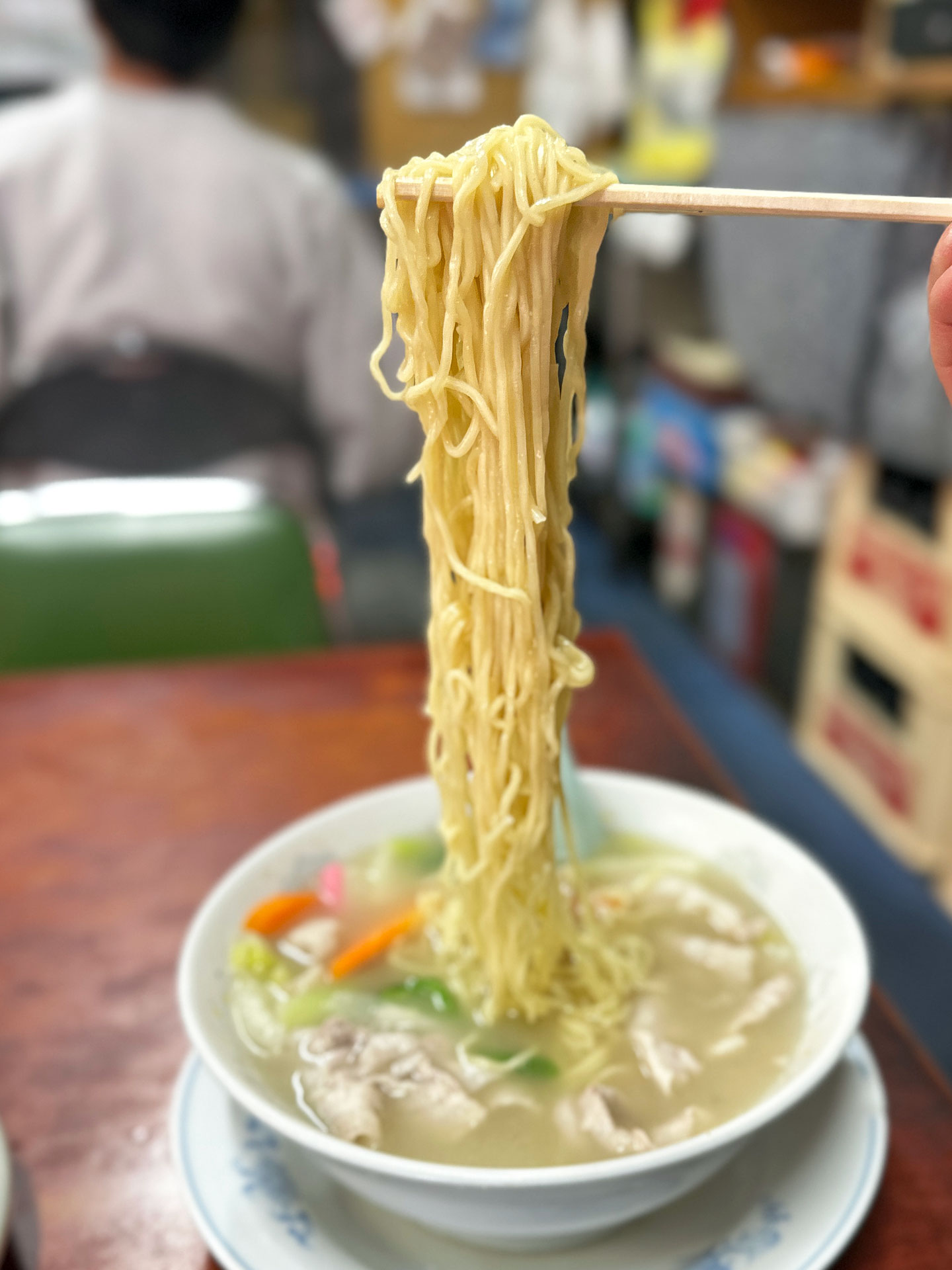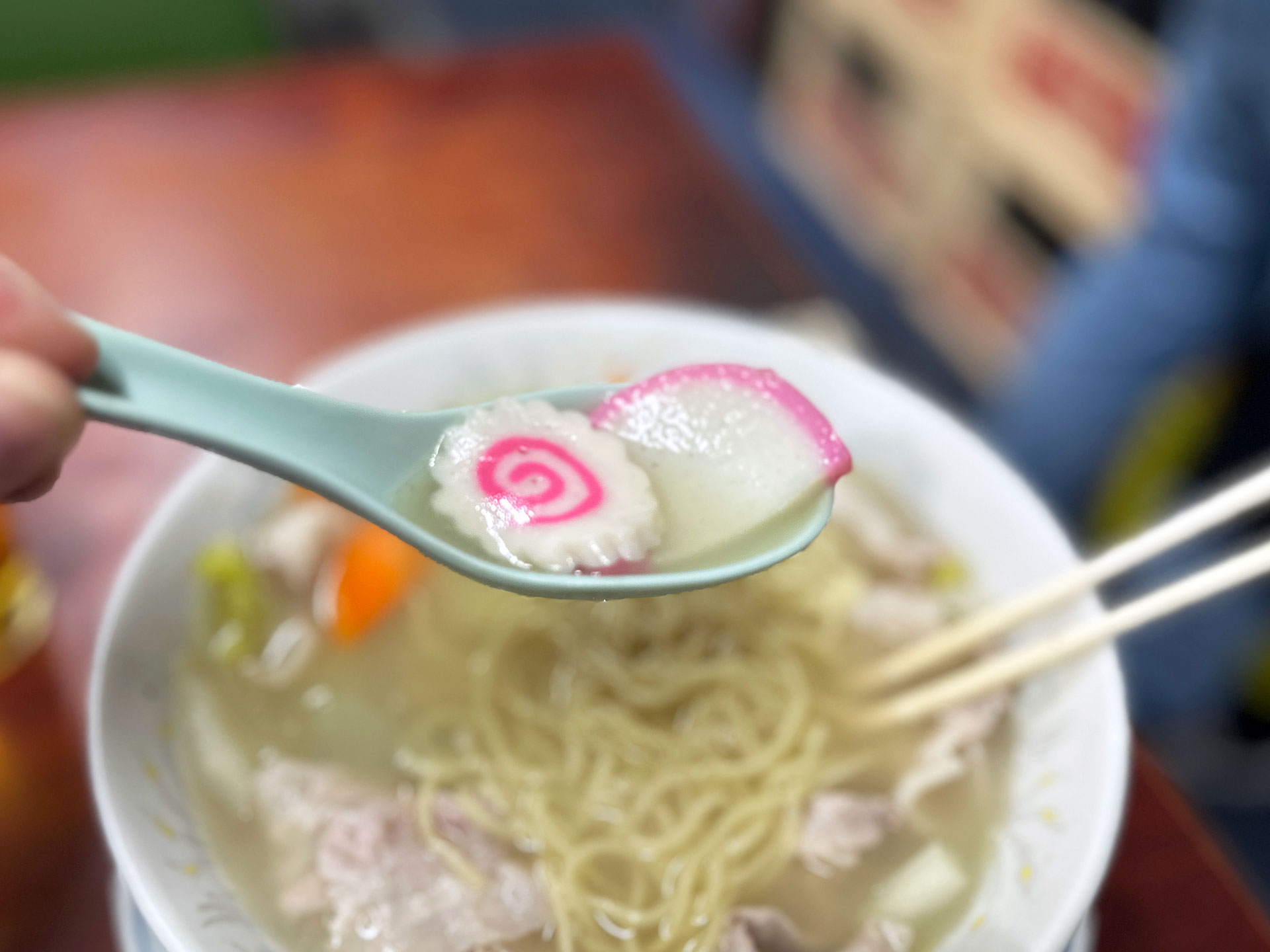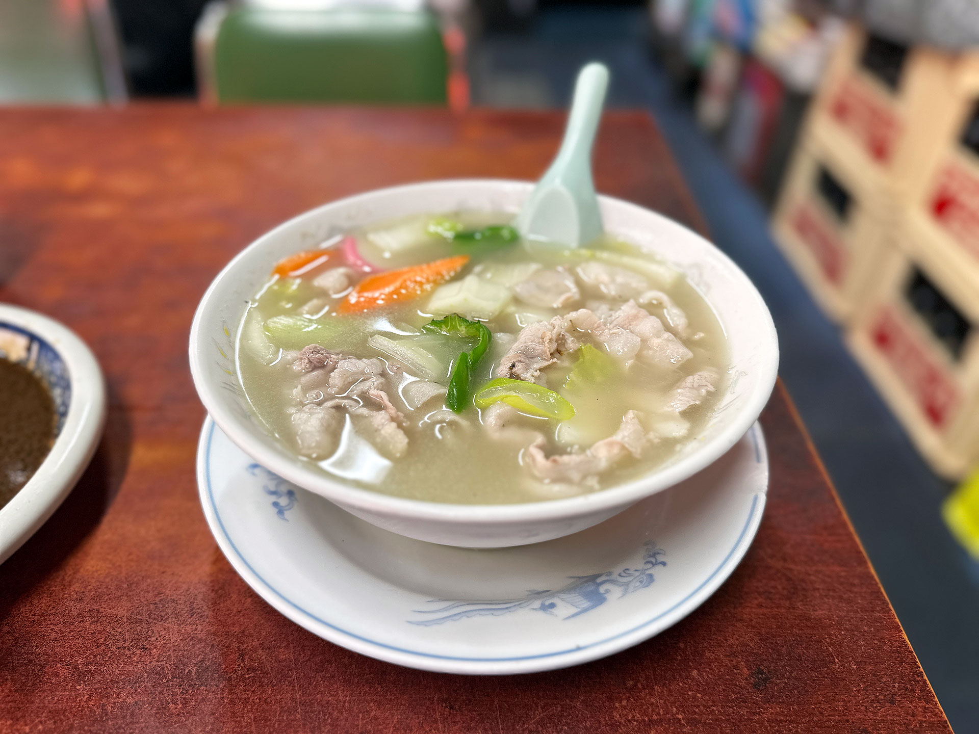 〆は白く美しい「肉そば¥850」。美しさとはウラハラに大衆的な昭和のうま味あじ。だがそれがいい。なぜならこれを求めているから。
