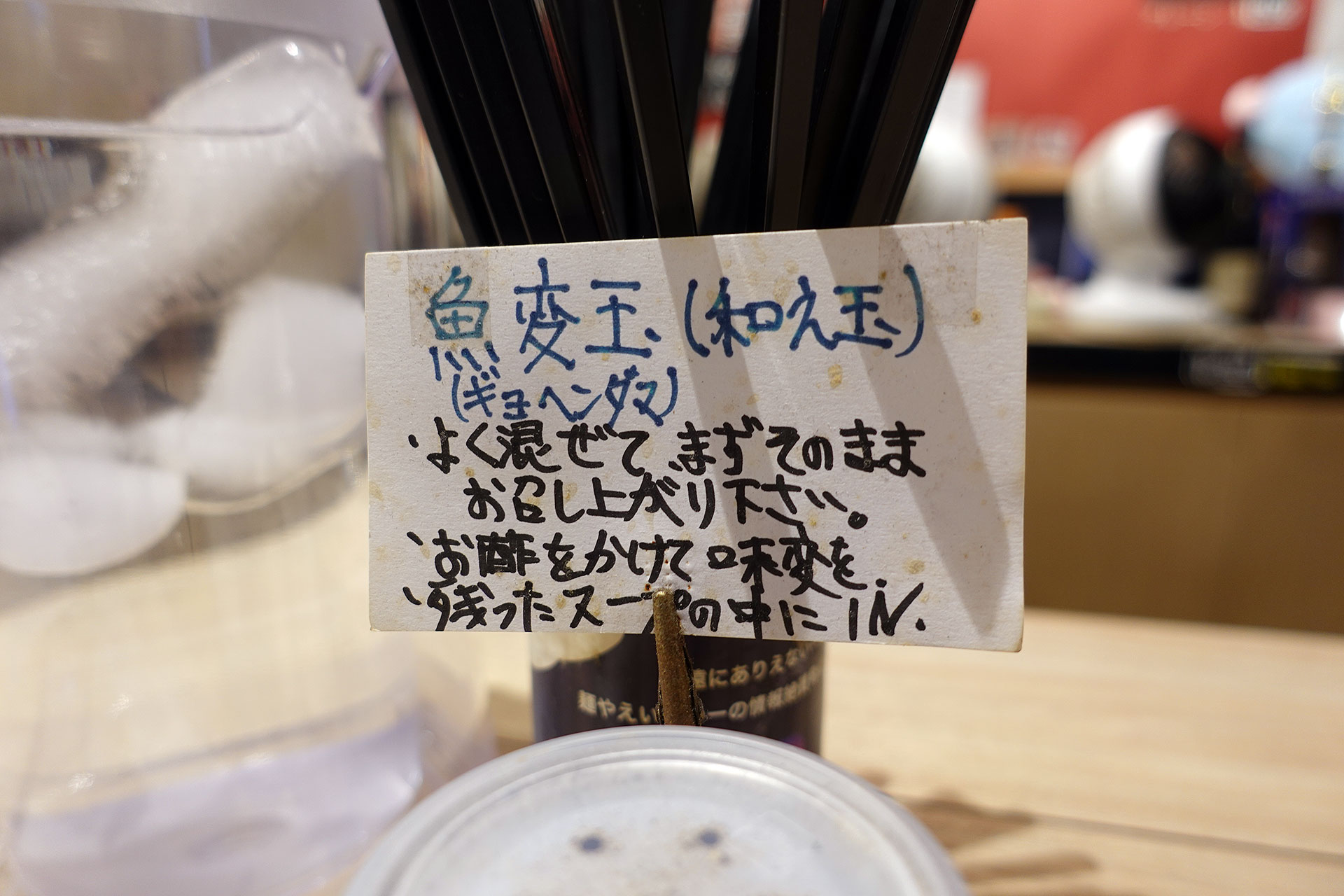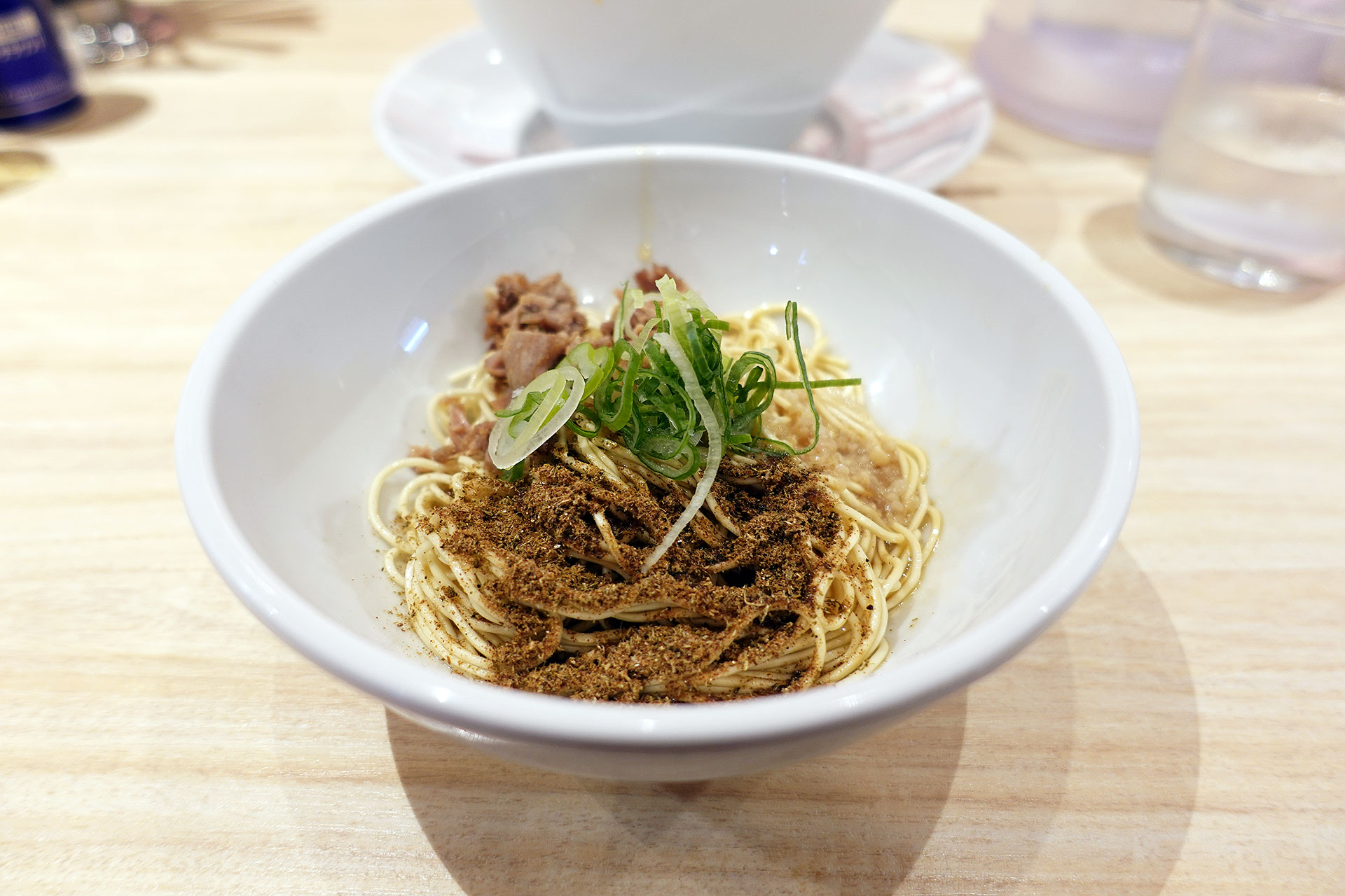 背脂と魚粉が際立つワイルドな味わい「魚変玉(和え玉)¥250/ハーフ」。