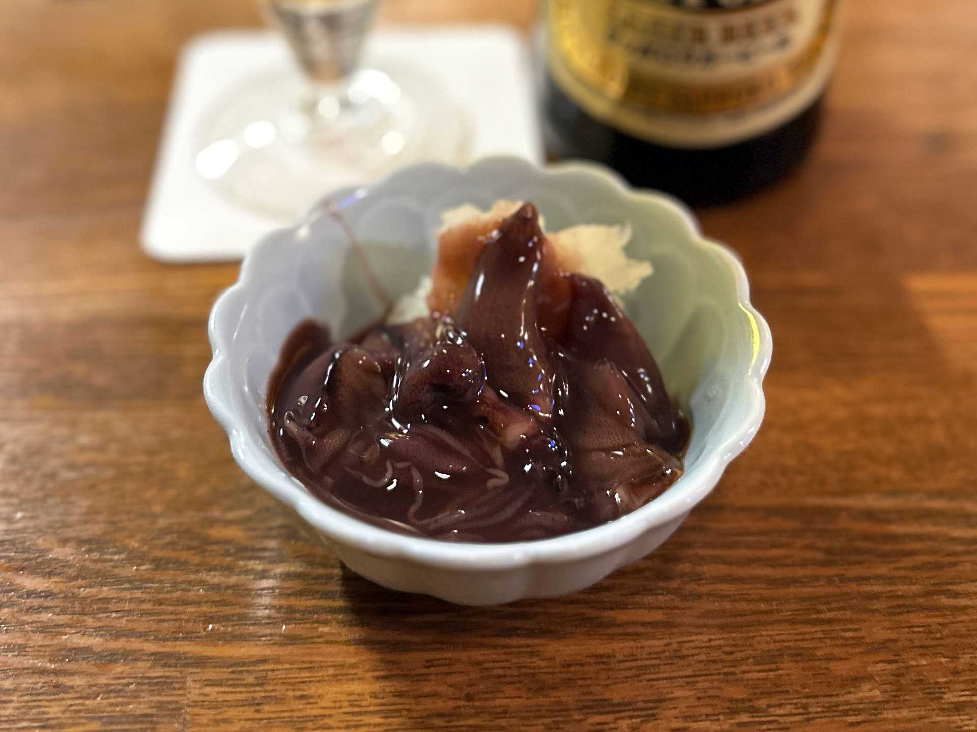 旬の「ほたるいか沖漬け¥400」はおろしたての大根とともに。日本酒にすればよかた…