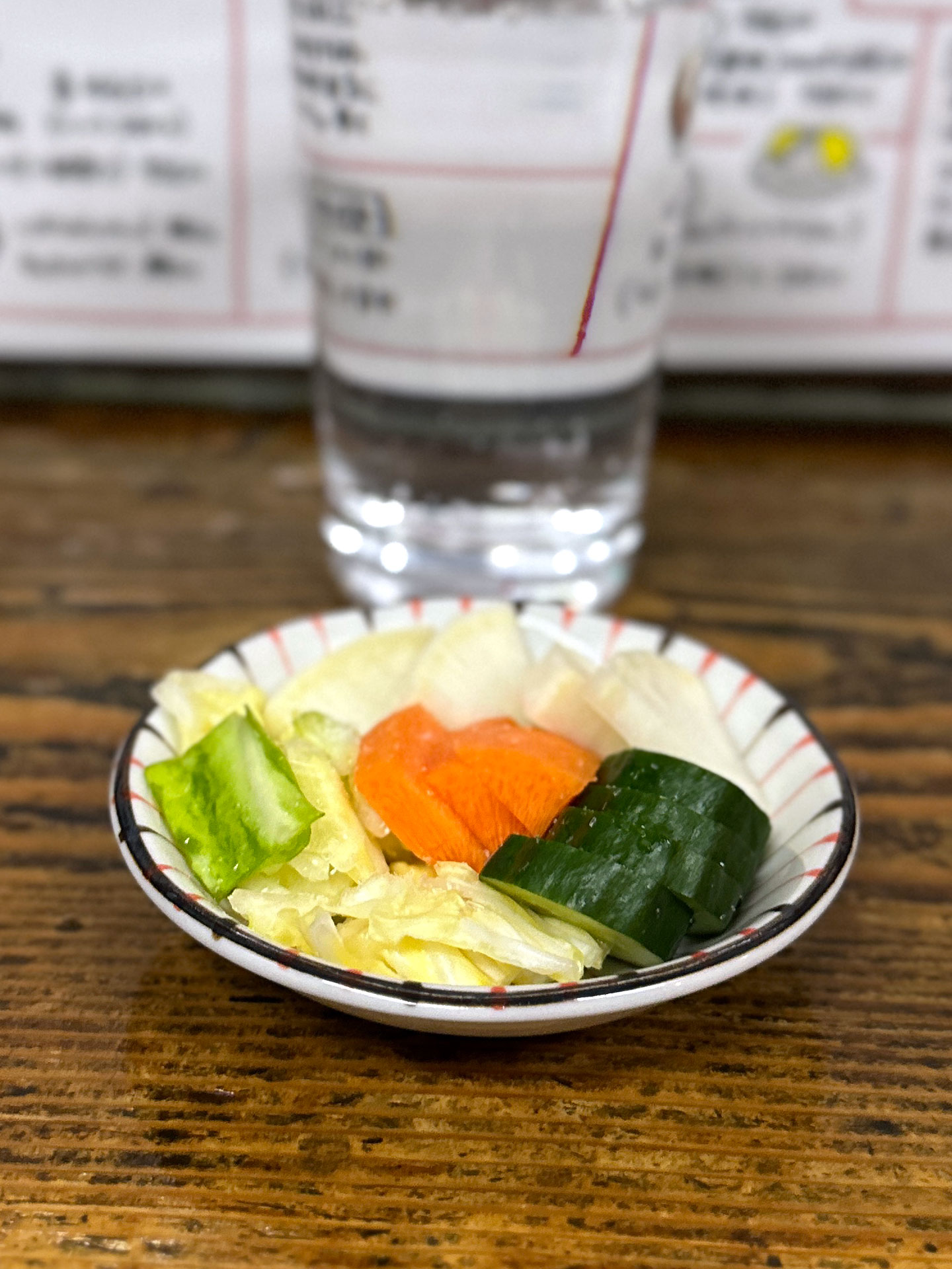 お通しの「お新香」と「酎ハイ¥350」でリスタート。