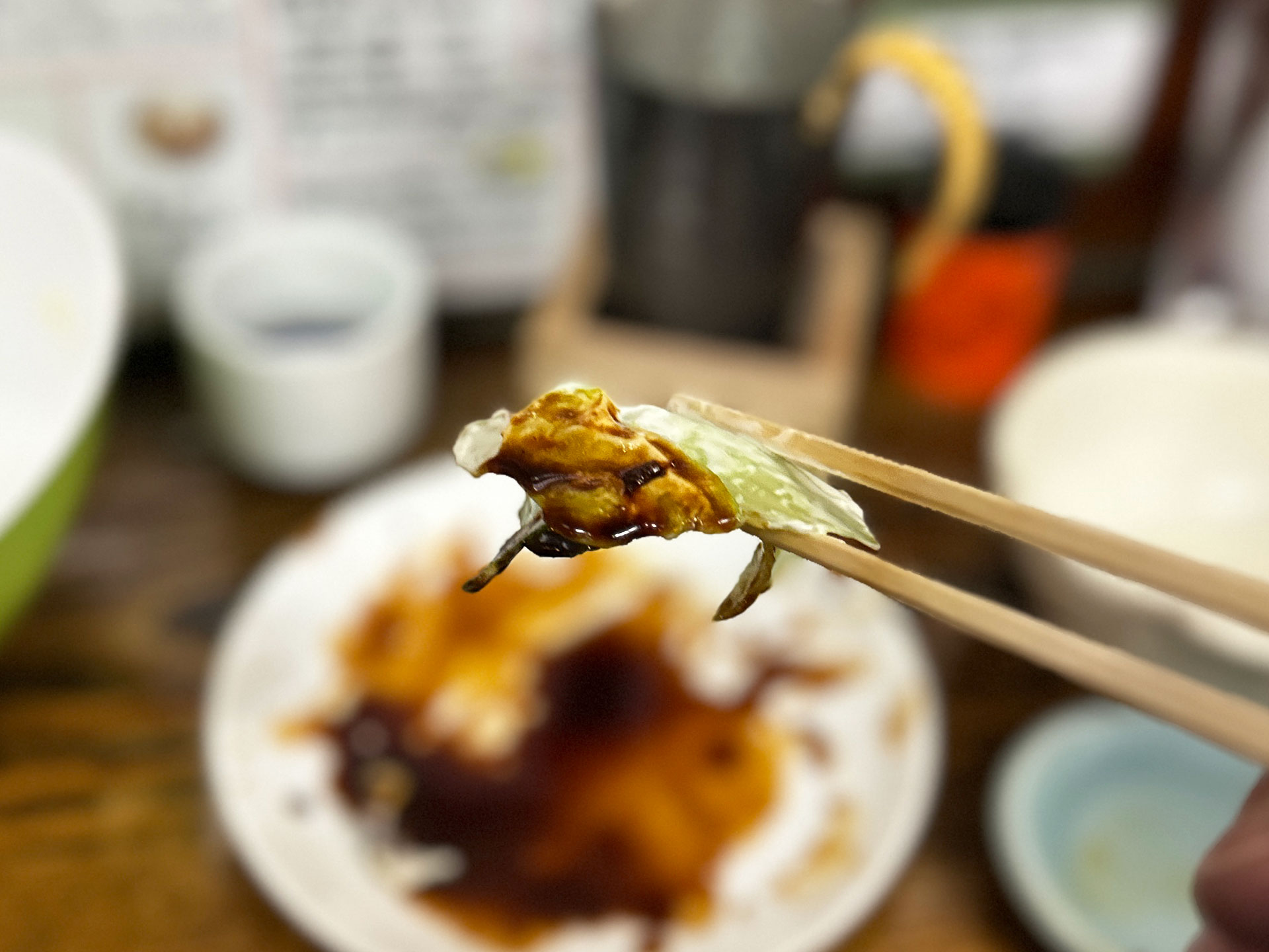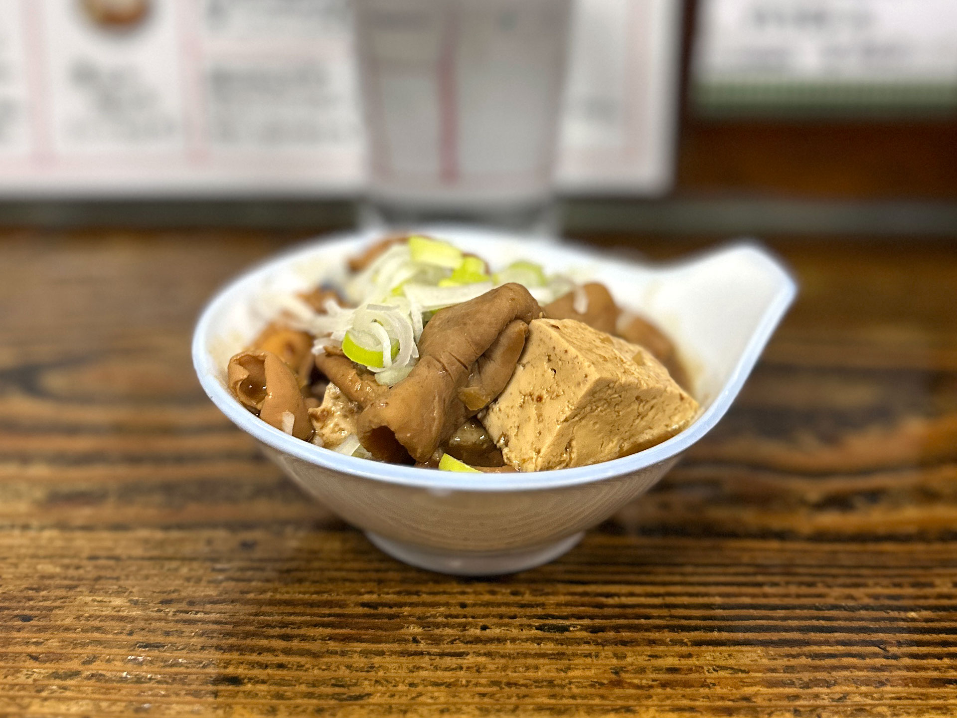 移動で冷えた体が暖まるアチアチ…濃い味「煮込み(ハーフ)¥320」。汁ものみ干し(1回目)。
