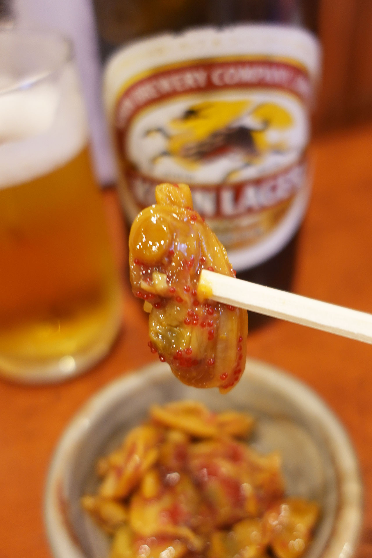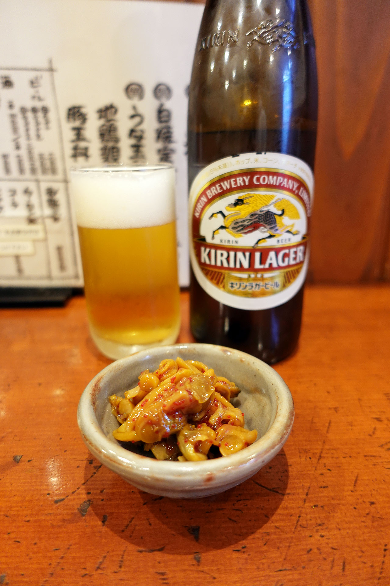 お通しのあさりの甘辛煮をつまみに「ビール大瓶¥600」をちびちびやる。