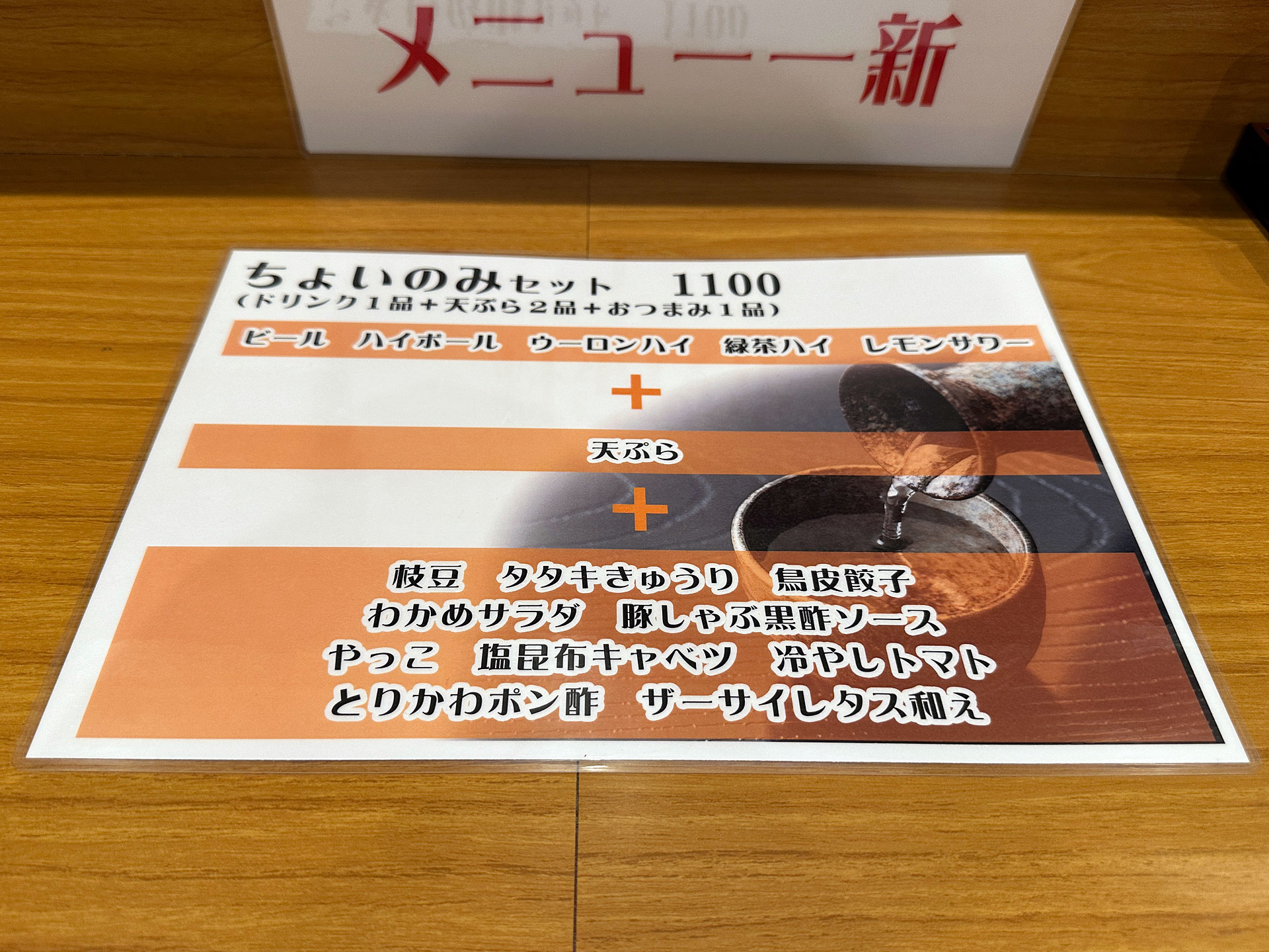 のみもの+天ぷら+おつまみ1品構成の「ちょいのみセット¥1100」を注文。