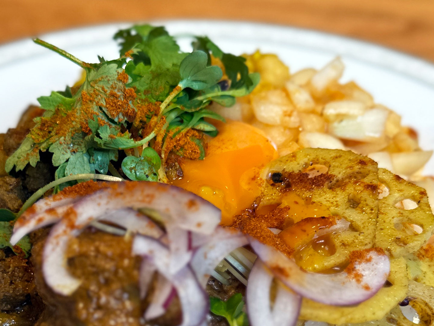 キーマカレー、ポークビンダル、玉ねぎ、蓮根、豆の上。