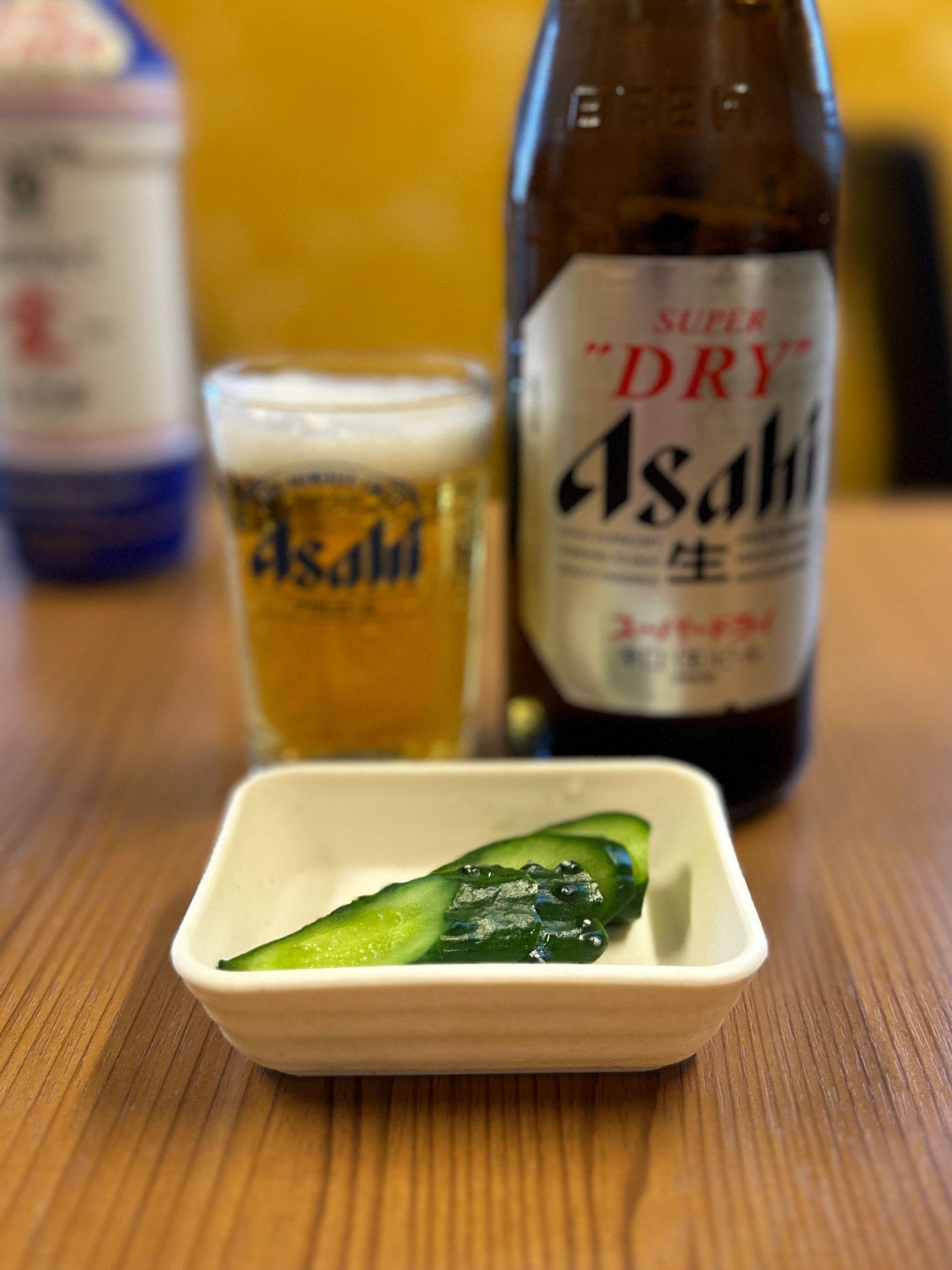ということで「中びんビール¥600」を注文。突き出しのきゅうりはありがたいことにサービス。