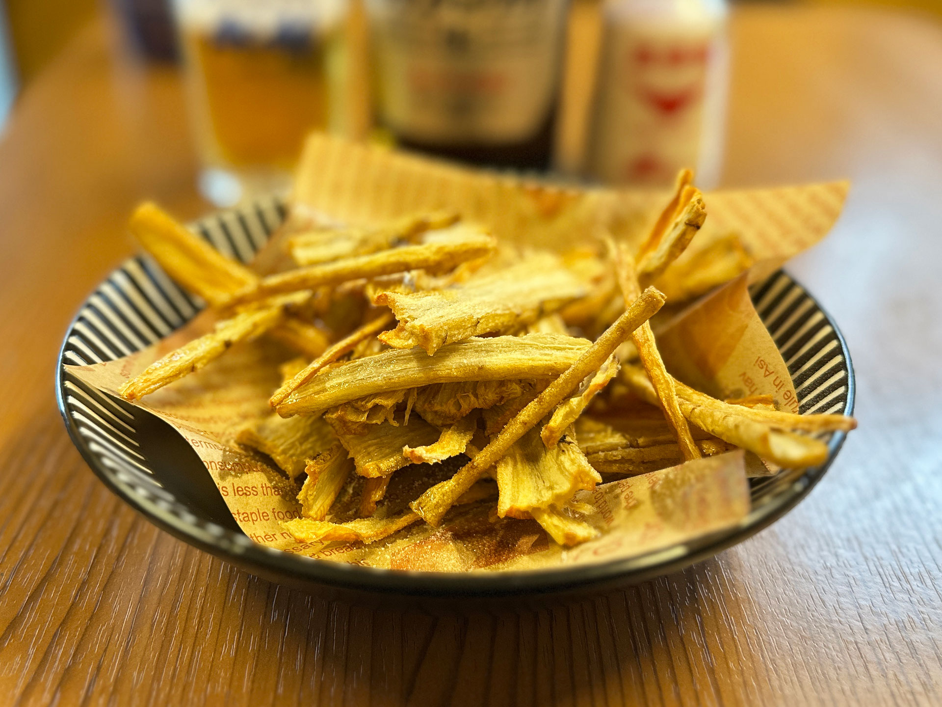 揚げたて「ゴボウチップス¥480」。昼からつまめてこのお値段。頭が下がる。