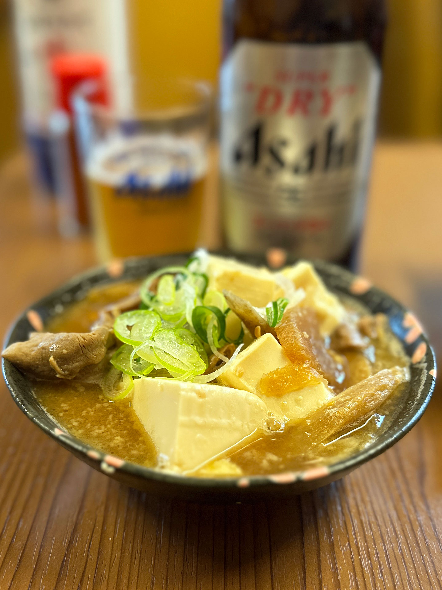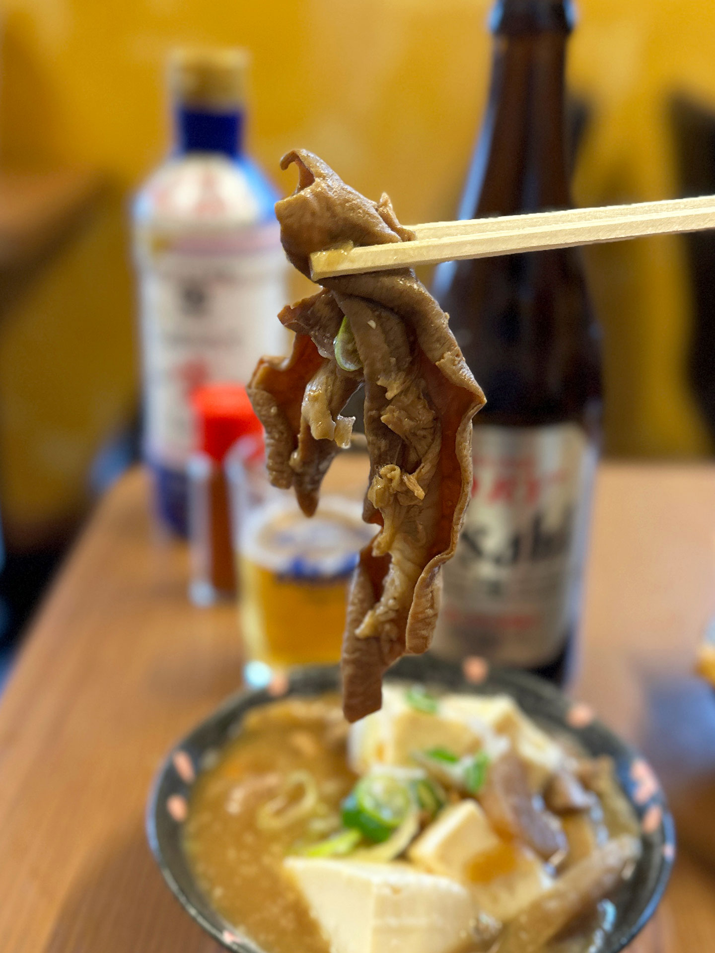 雨降りの冷える日に汁モノは格別「モツ煮込み¥450」。