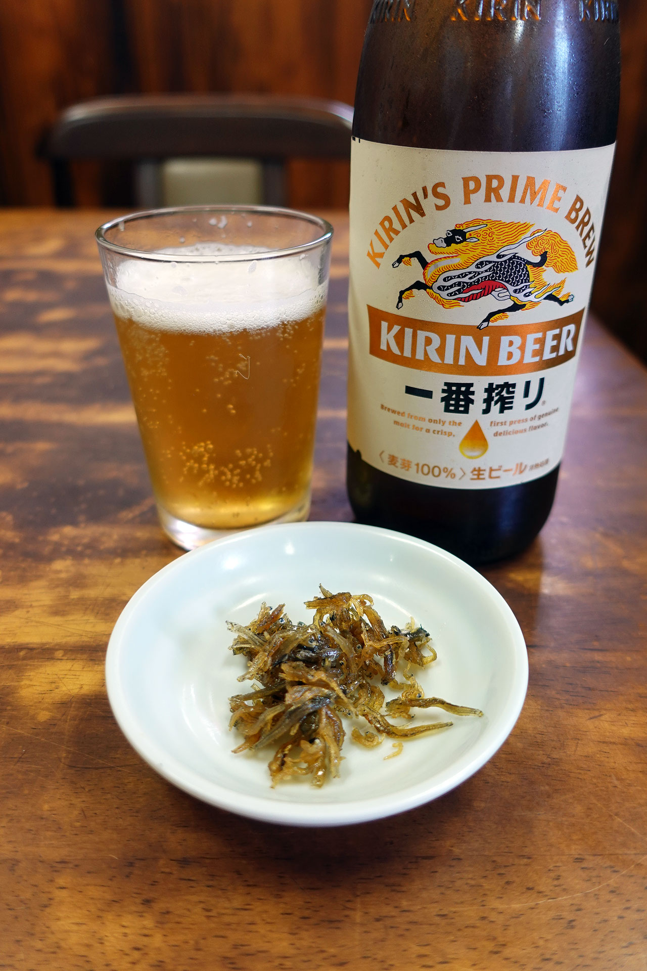 「瓶ビール」をちびちびやりながらのランチタイム。突き出しのちりめん山椒が嬉しすぎる。