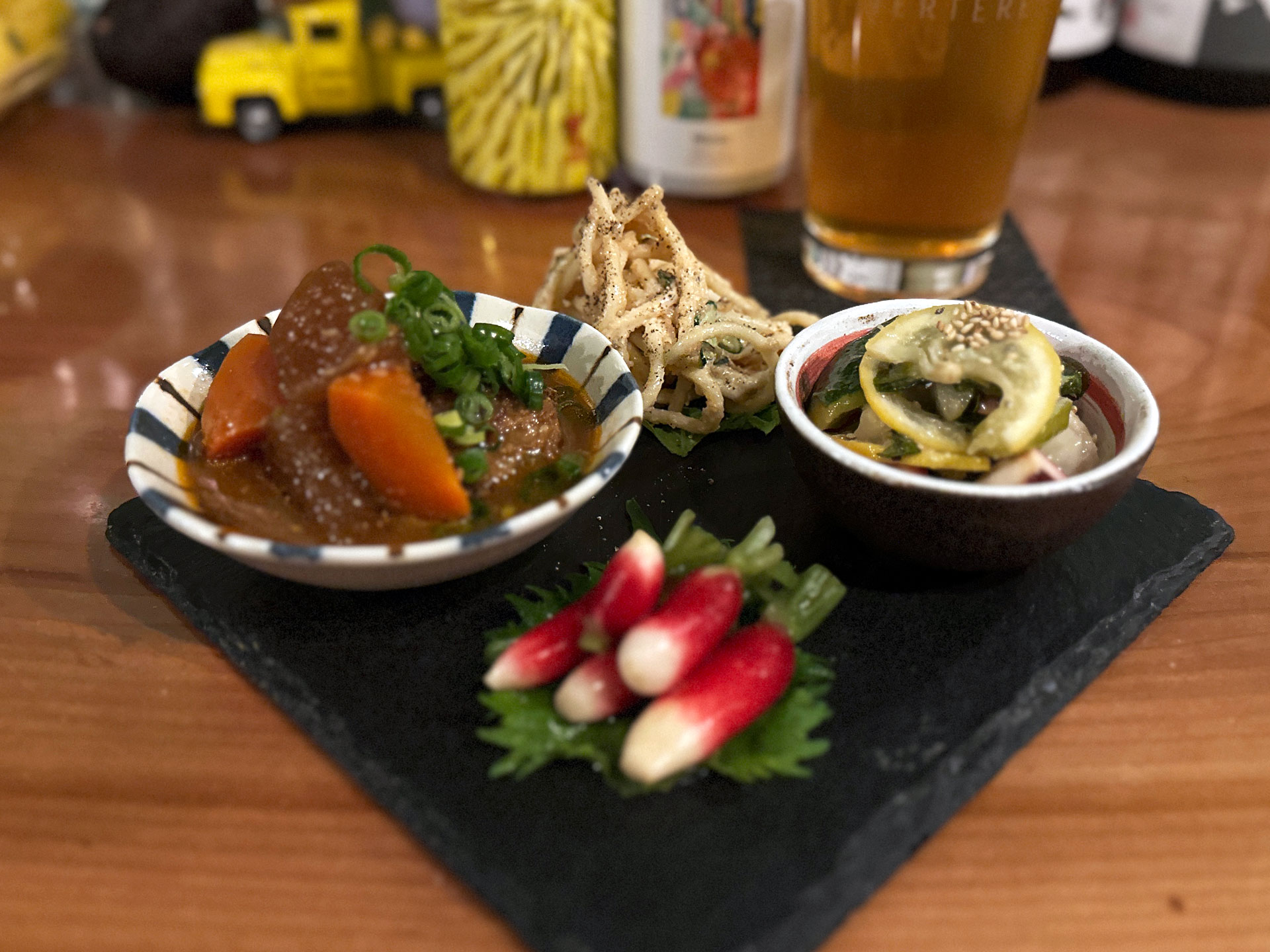 ビールにも日本酒にも炭酸割りにもフィットする「おまかせおつまみ三種盛り」。