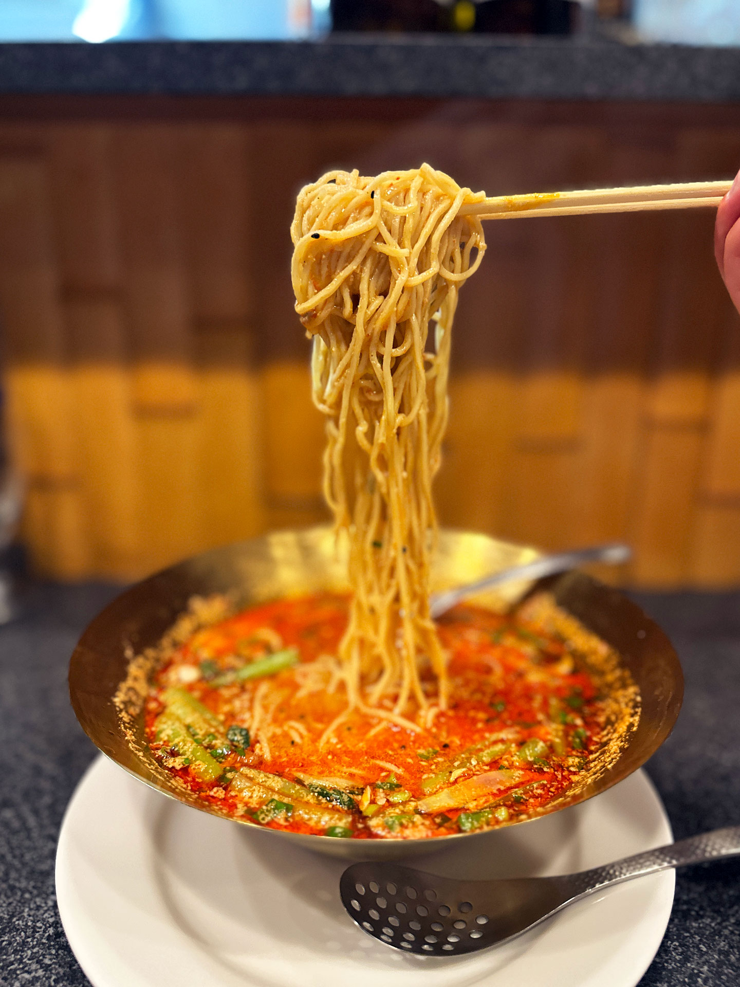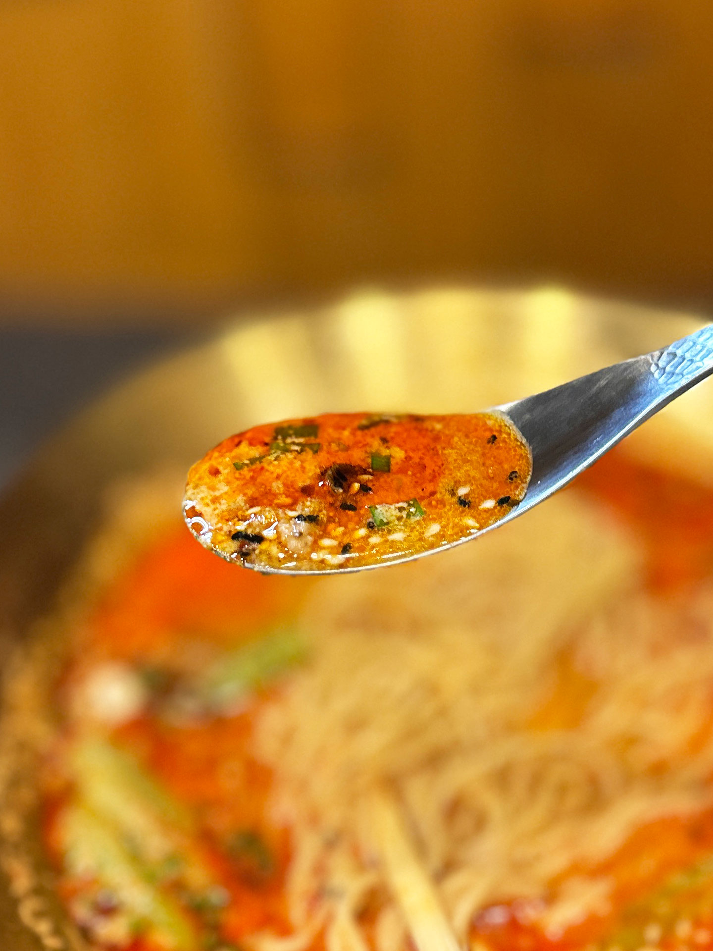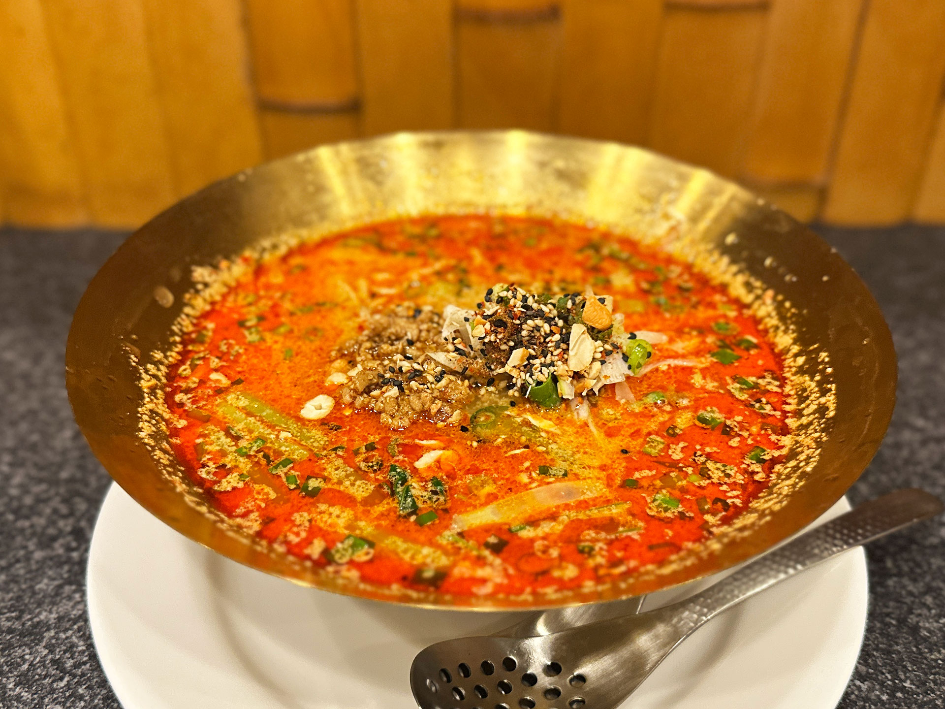 金色の器、スープに浮かぶ赤い油が眩しい「四川担々麺¥950」。