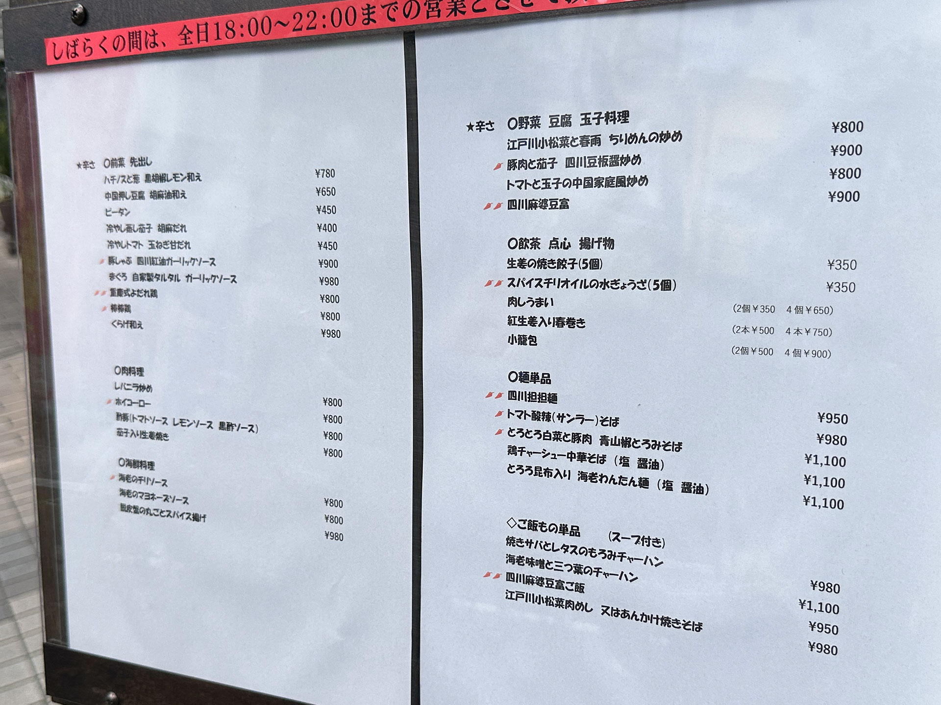 メニュー&営業時間。(ここまでは何日か前の昼の写真)。