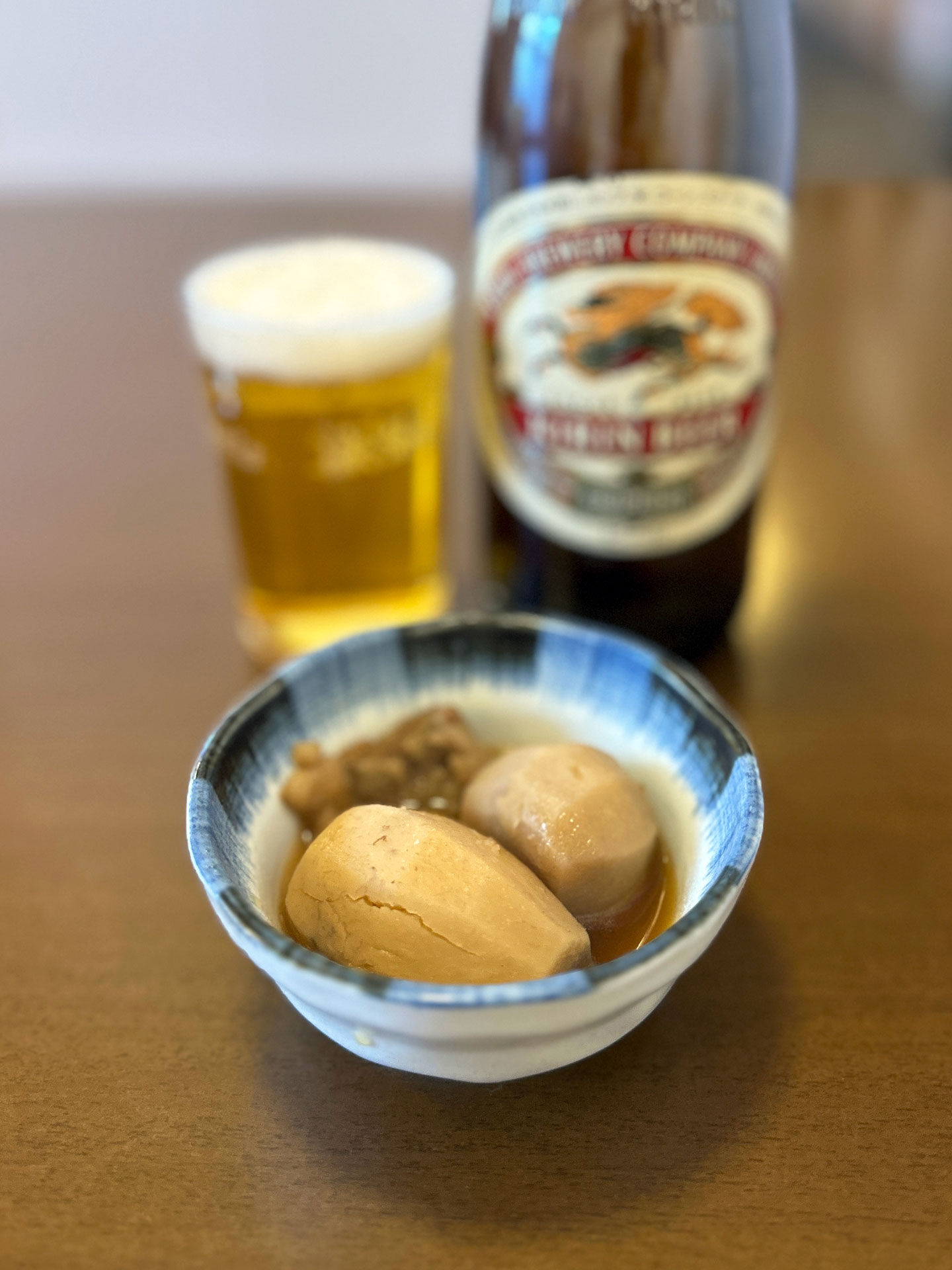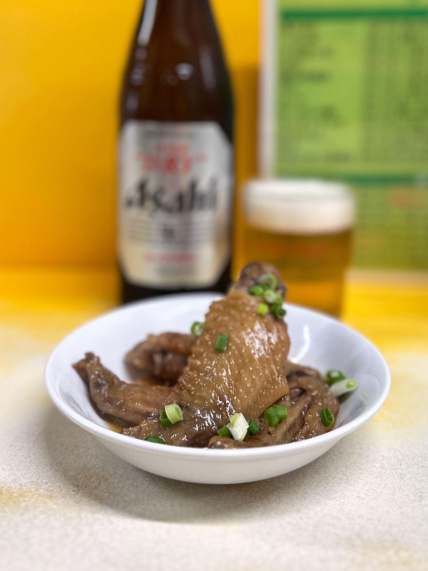 暗くなってもほろとろ甘ダレ「手羽煮 ¥250/1本」ツマミに「瓶ビール¥650」。