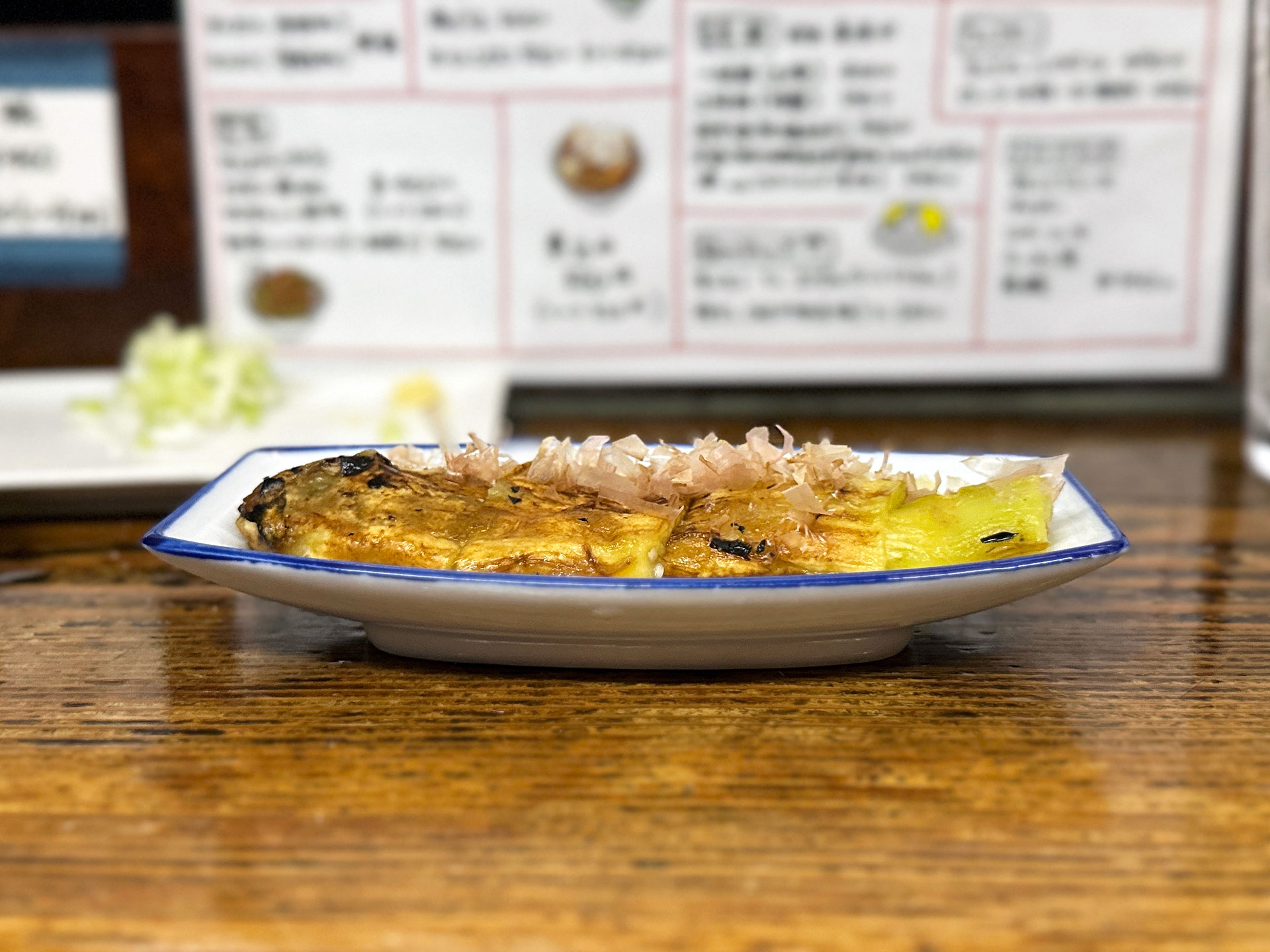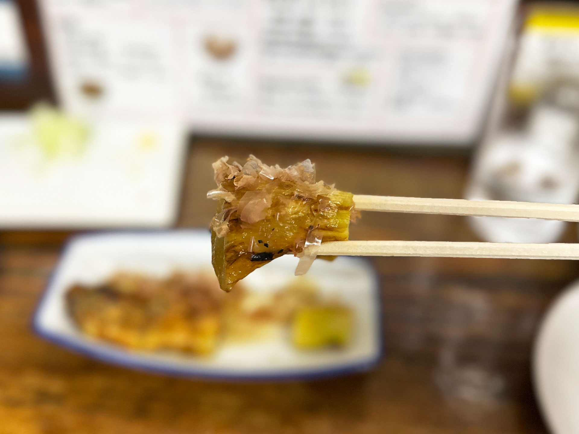 スモーキー鰹節、炭火の香りが仲良し「焼きなす(1本)¥280」。
