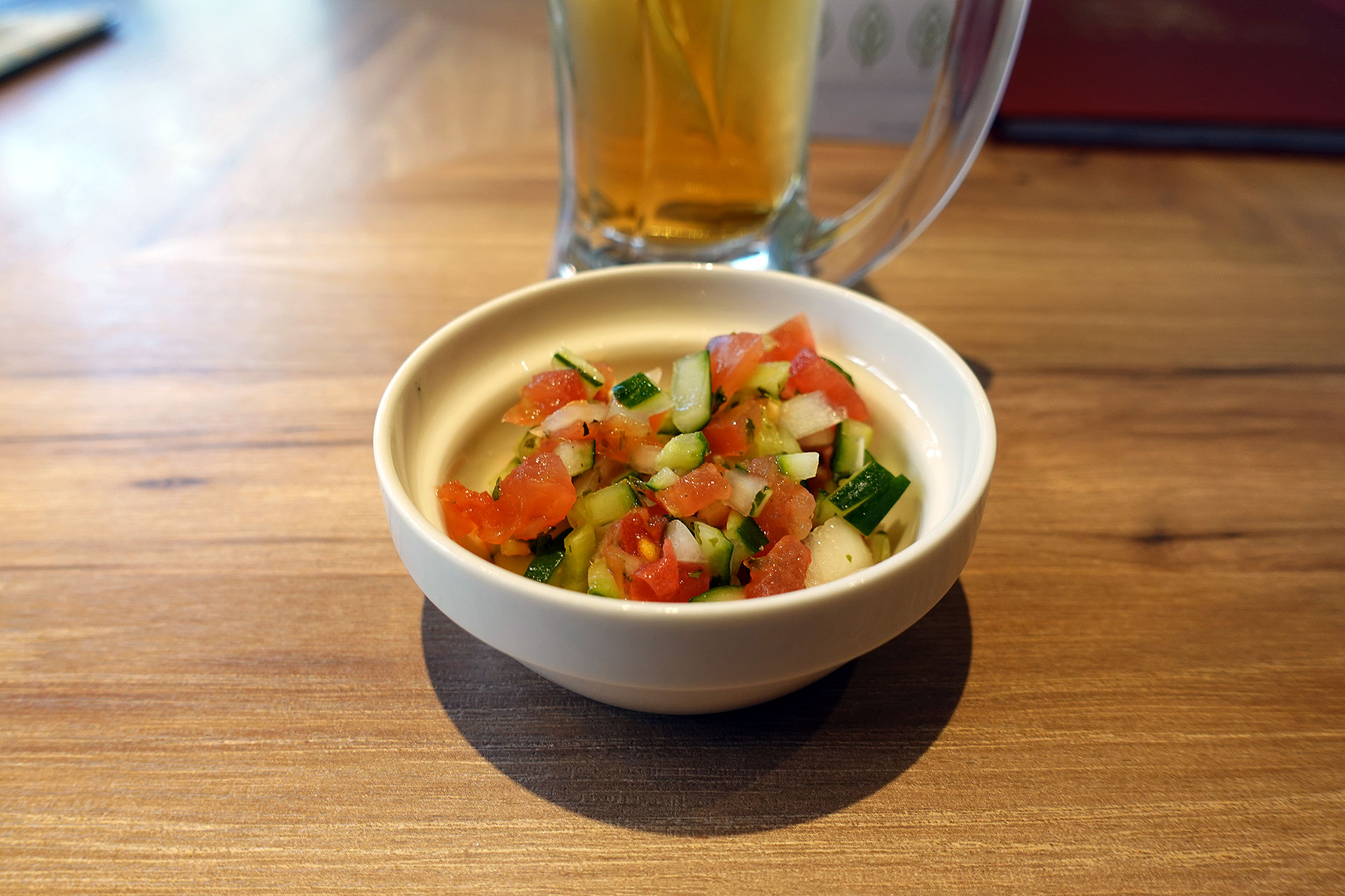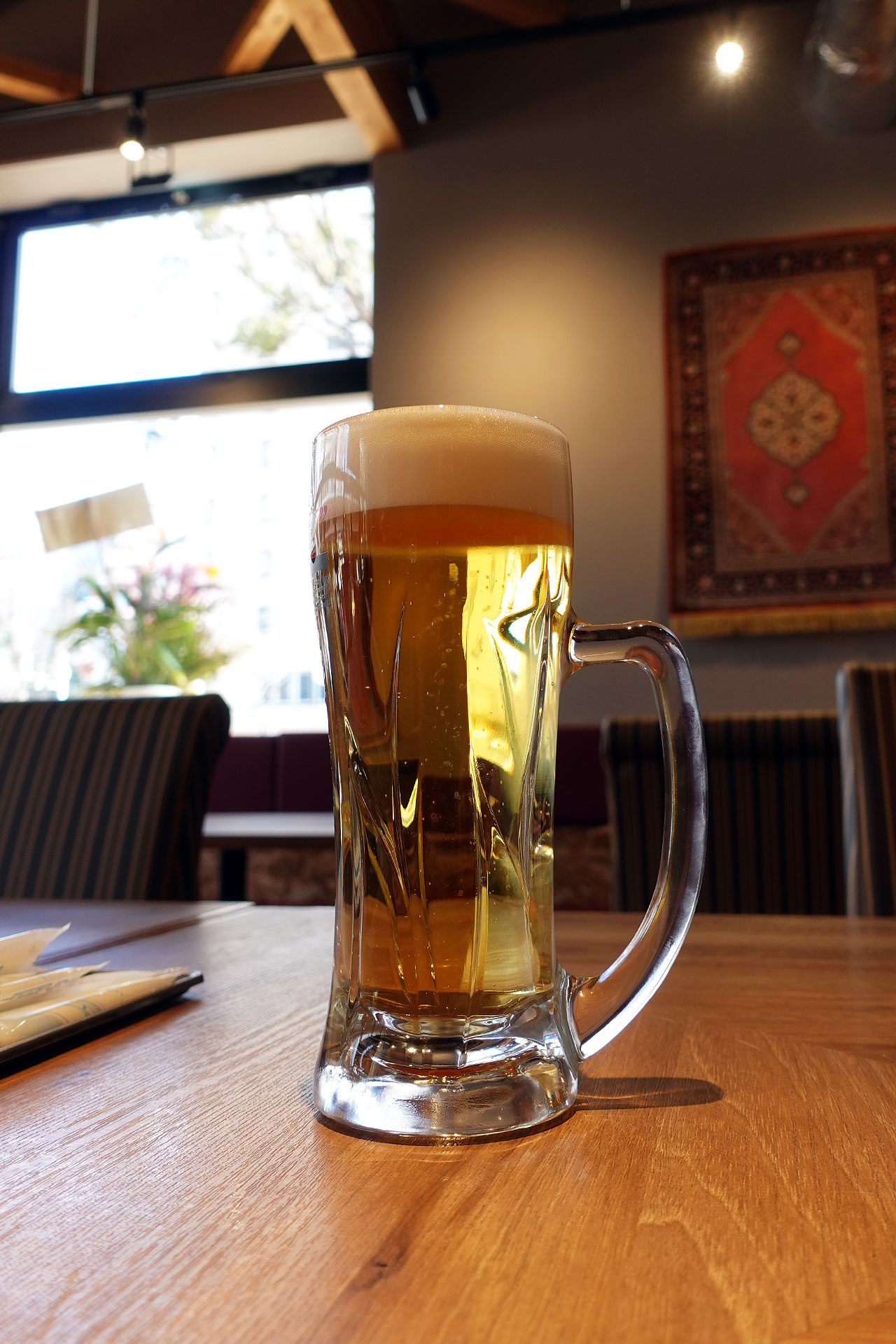 ミントが効くサラダをつまみに「生ビール¥600」。