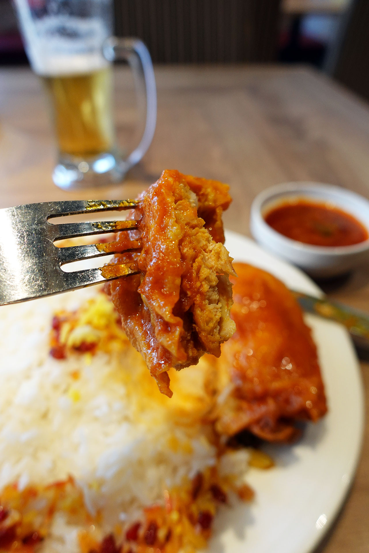 エキゾチックなソースを纏うチキン。ライスもビールもススム。
