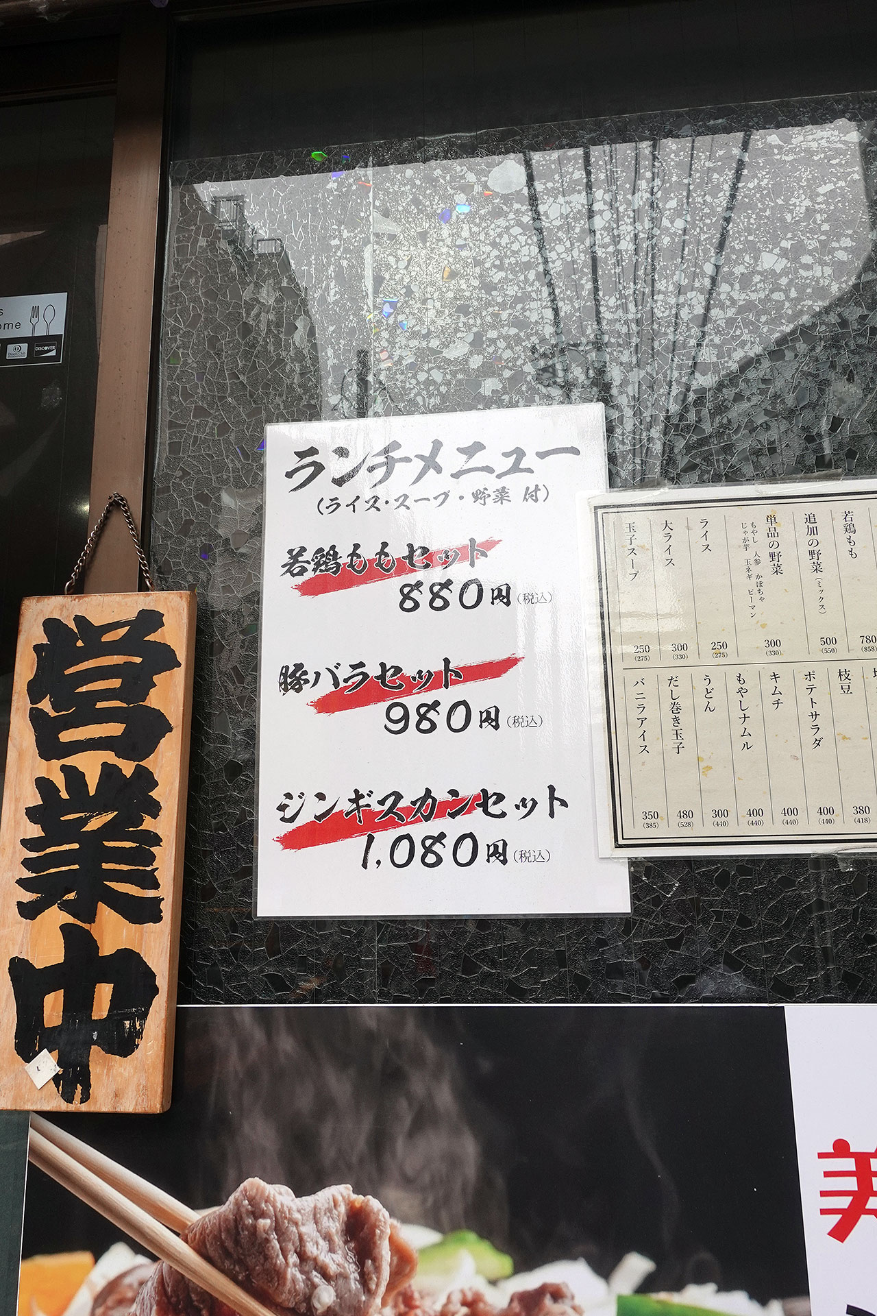 並ラム、野菜、ごはん、スープがセットのランチメニュー「ジンギスカンセット¥1080」。