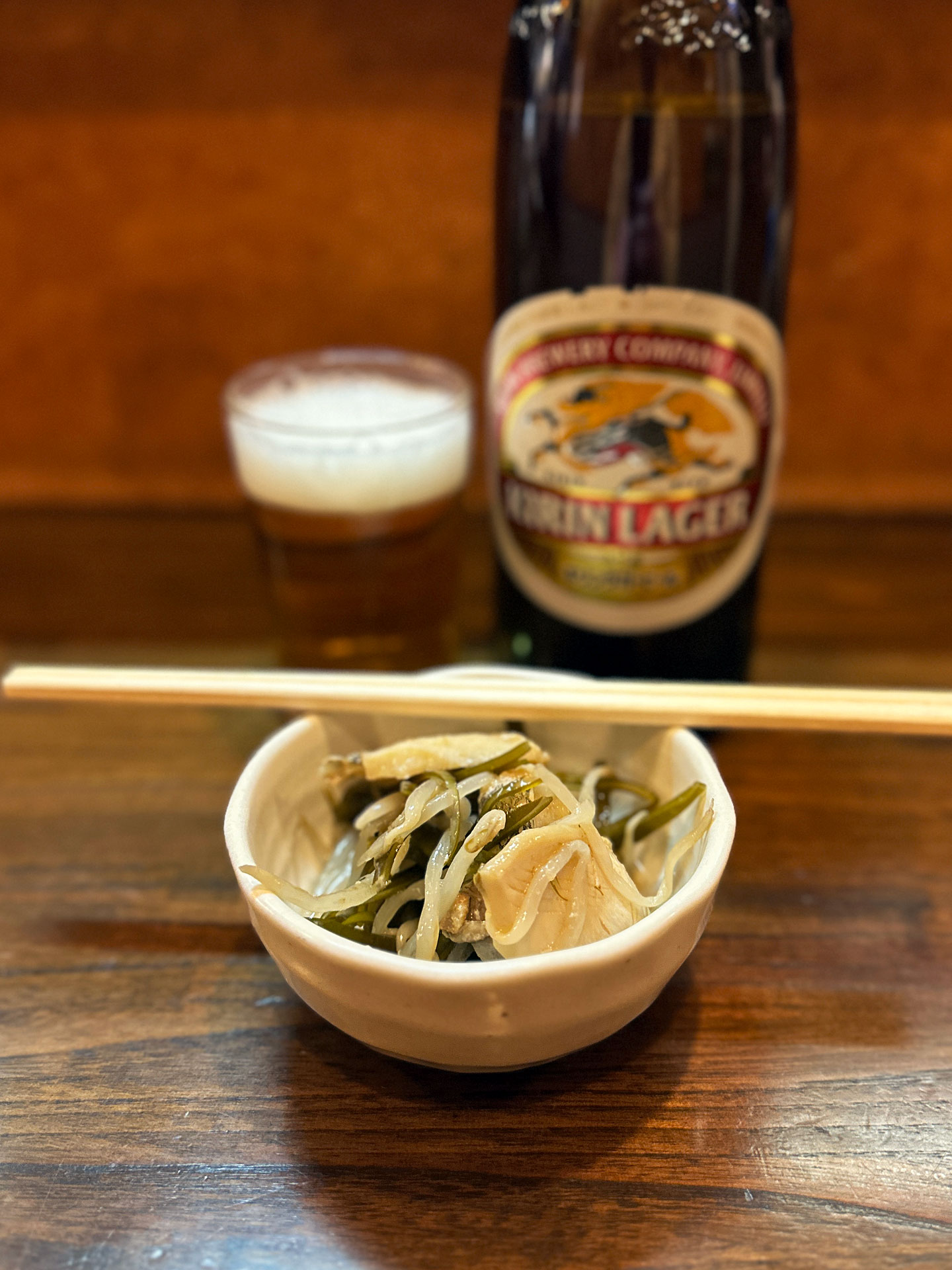 「瓶ビール大瓶¥850」をお通しでしっぽりやりながら注文を考える。