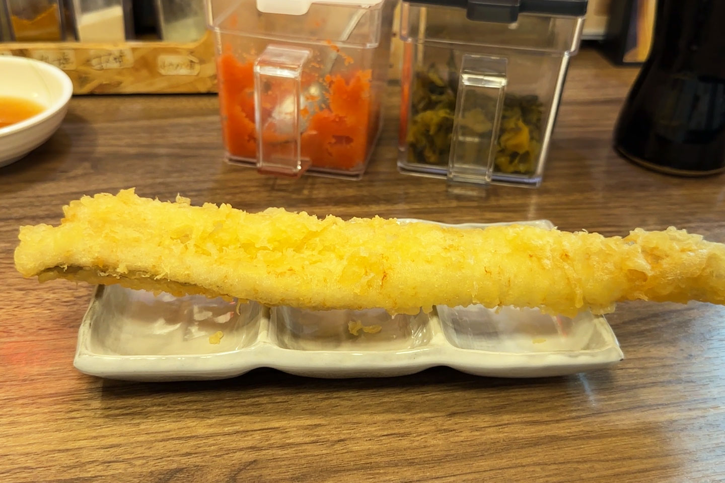 5種の塩と天つゆ。異なる味で肉厚穴子を完食。