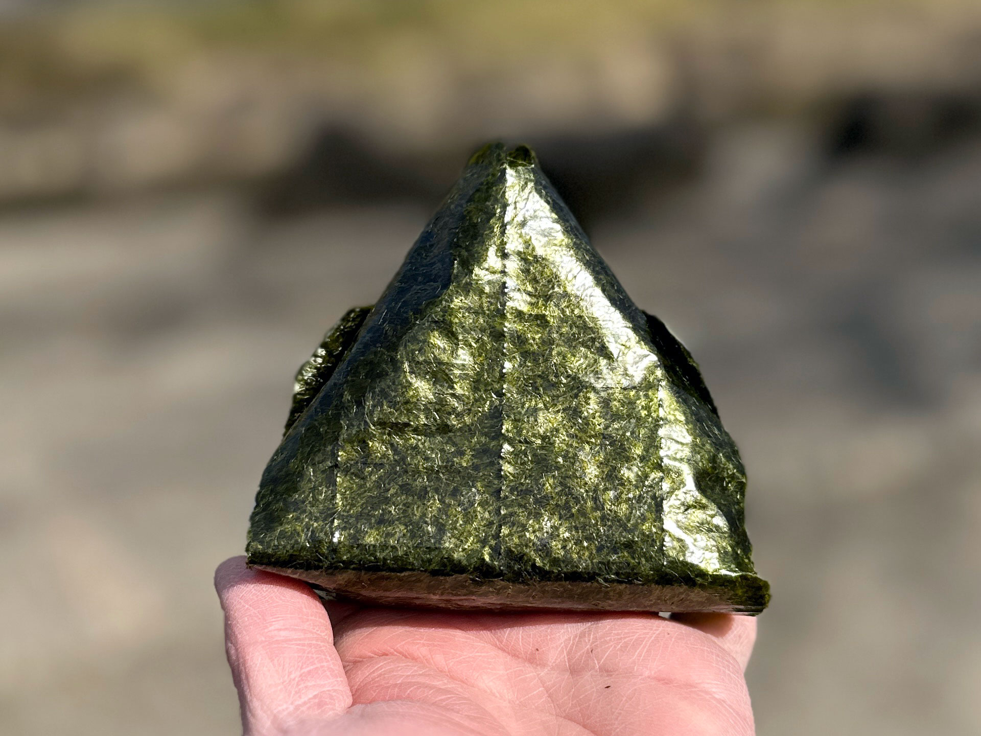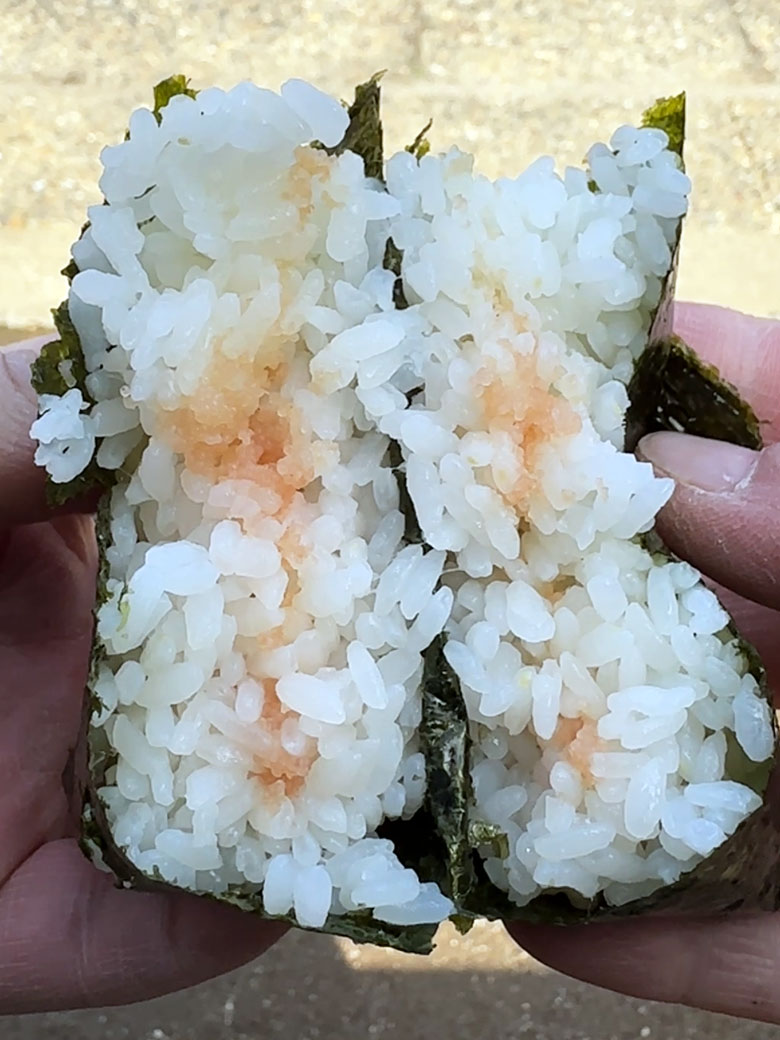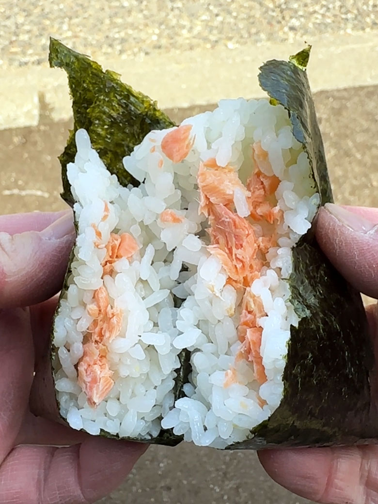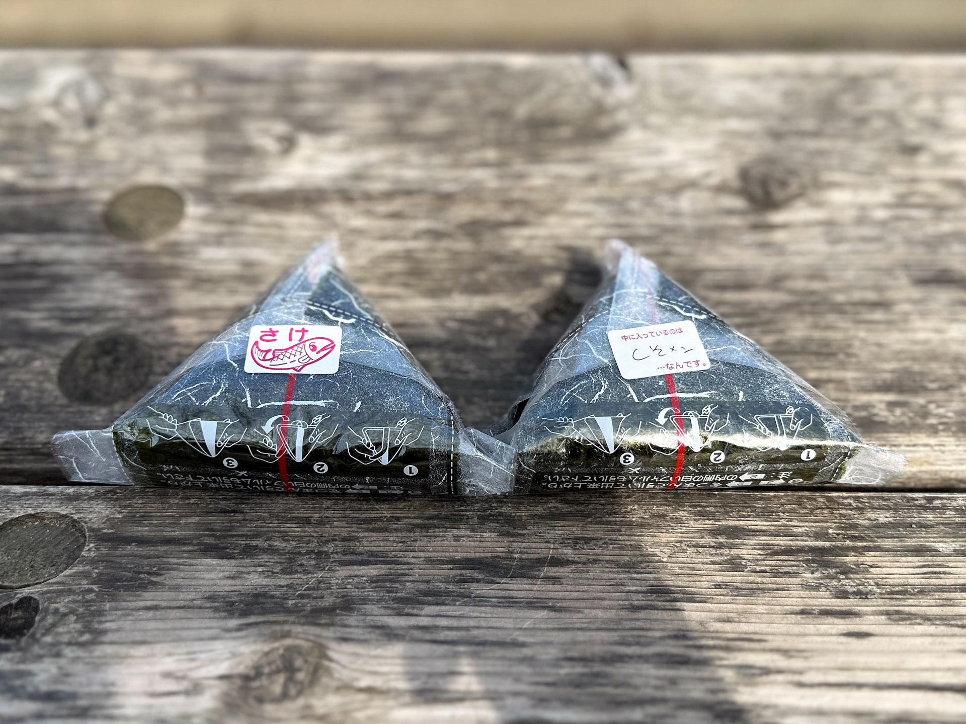 「人気NO1店内手ほぐし鮭おむすび¥300 青しそ明太子¥300」をテイクアウトし森林公園移動。